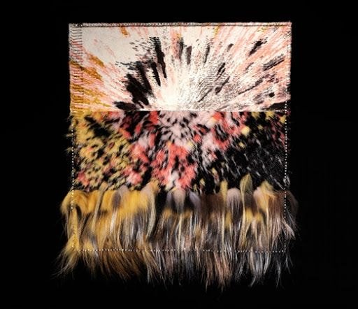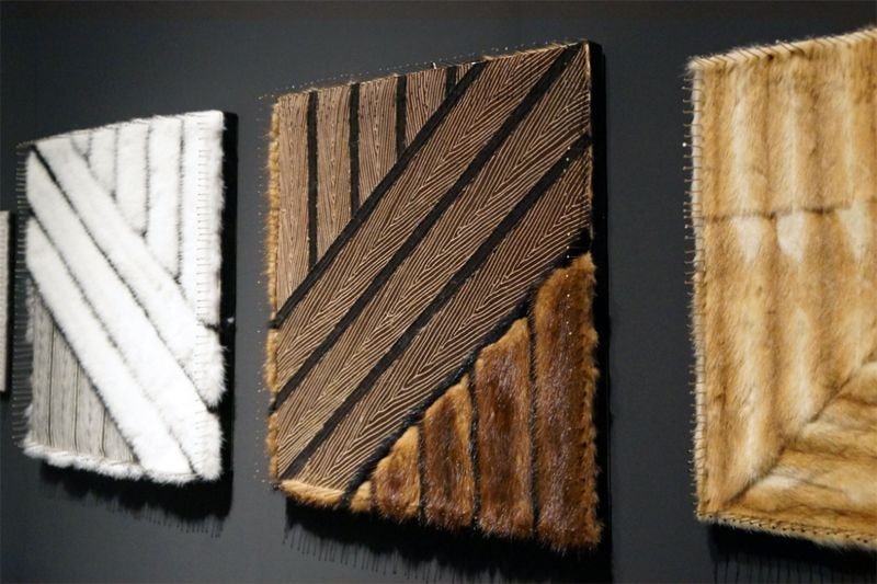모피들을 길게 조각내 V자로 이어붙이는 기하학적 패턴을 만들었음